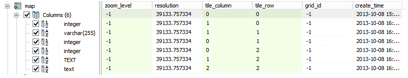 The map table is used to record row number, column number, resolution, id corresponding to the grid, scale, tile level, time for tile creation, etc. of each grid. The structure of the table is as follows: