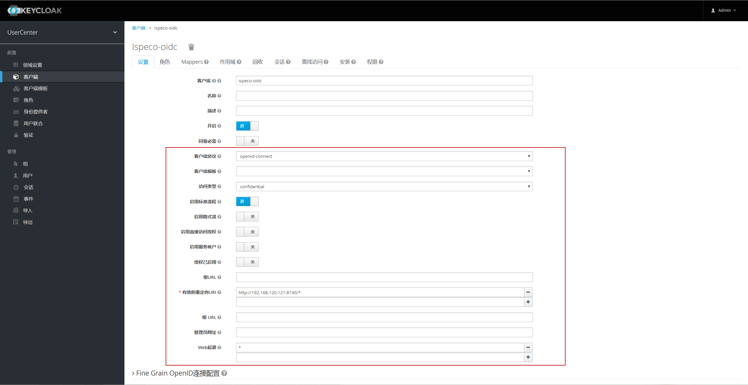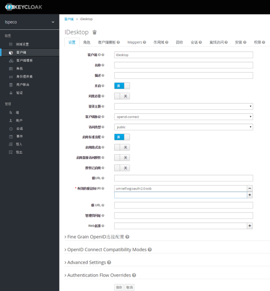 左侧导航栏选择客户端,在客户端列表中点击ispeco-oidc,进入客户端详情页面: