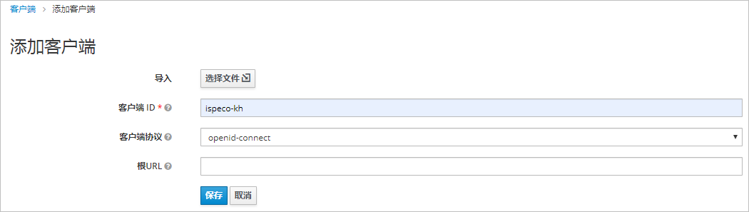 - 客户端 ID:输入“客户端 ID”,该“客户端 ID”您可以随意命名,例如:ispeco-kh。该“客户端 ID”对应 SuperMap iPortal 中的“Keycloak 登录配置”中“关联的 public 客户端 ID”。