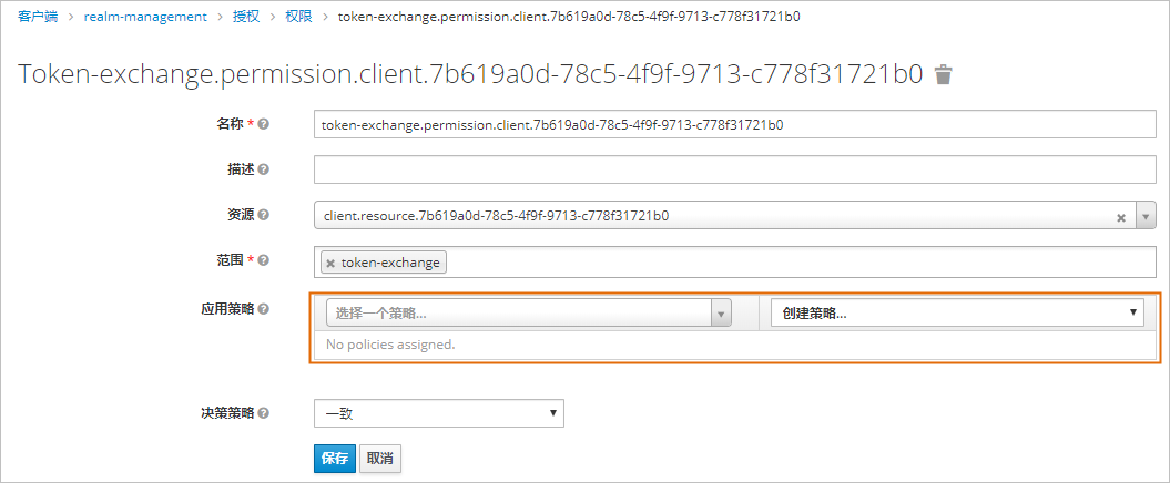 - 点击 token-exchange,进入 token-exchange 权限设置页面,如下图所示:
