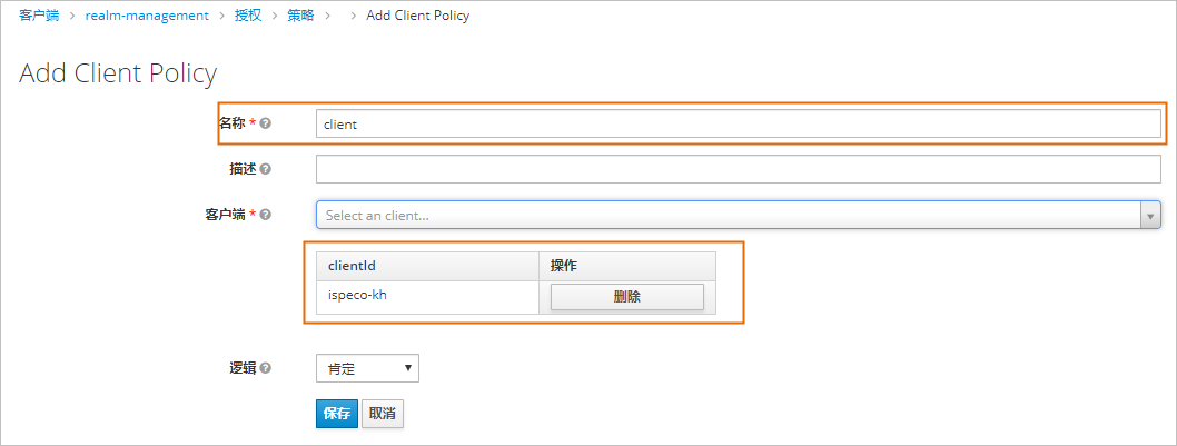 - 客户端:选择与当前客户端进行权限关联的客户端,此处应选择步骤一中创建的客户端 ispeco-kh 进行关联。