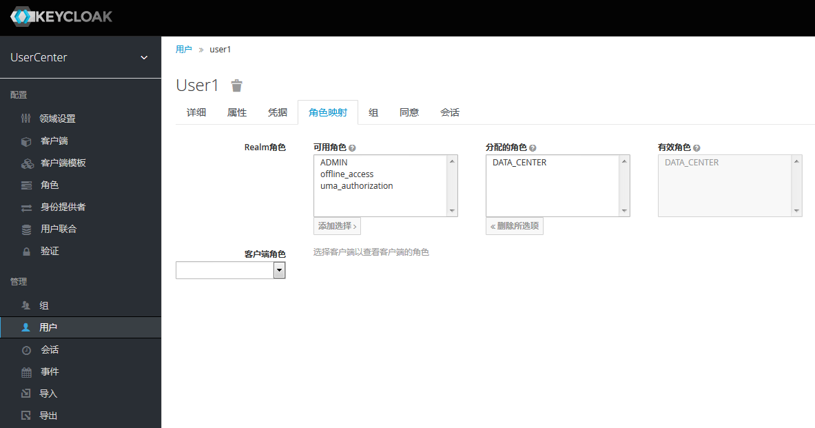 选择角色映射选项卡,选中要分配给用户的角色,点击添加选择按钮,完成角色的分配。至此,完成管理员添加用户流程。