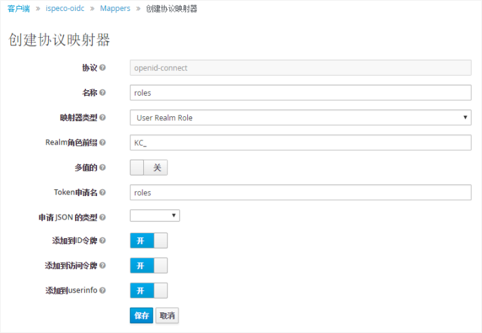 - 名称:映射器的名称,可随意填写,例如:roles,建议与下面的“令牌声明名称”保持一致。