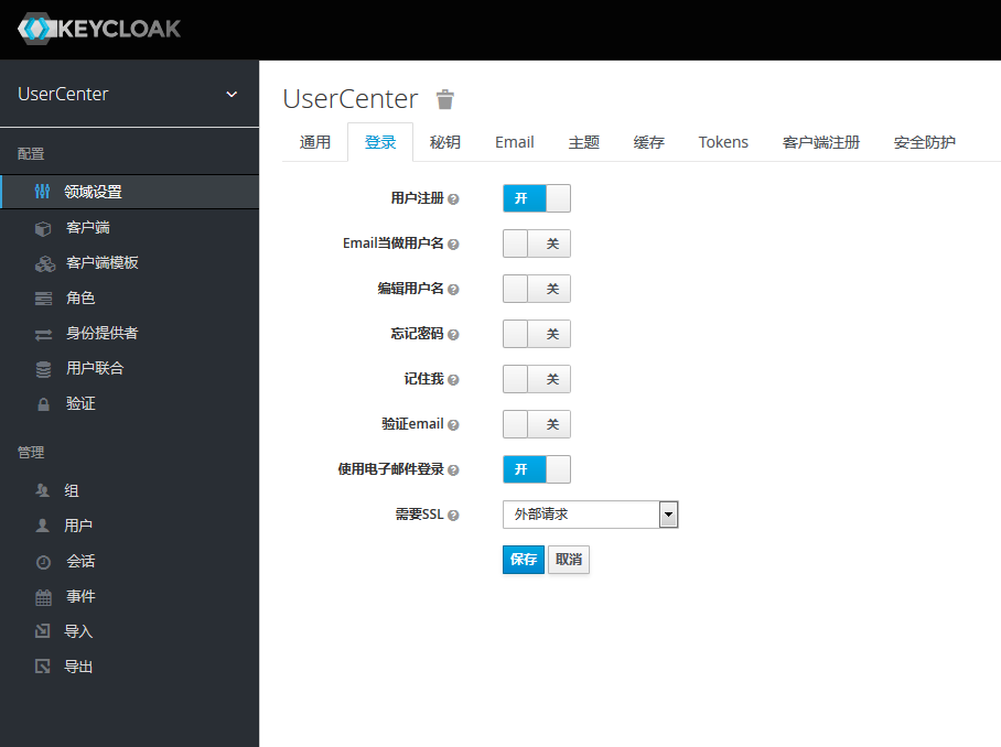 在 Keycloak 登录页面中可以开放用户的注册功能,管理员需要在 Keycloak 管理页面中进行配置。选择左侧导航栏领域设置,点击登录选项卡,启用用户注册选项,其余设置可按需求进行选择性启用,完毕后点击保存按钮。