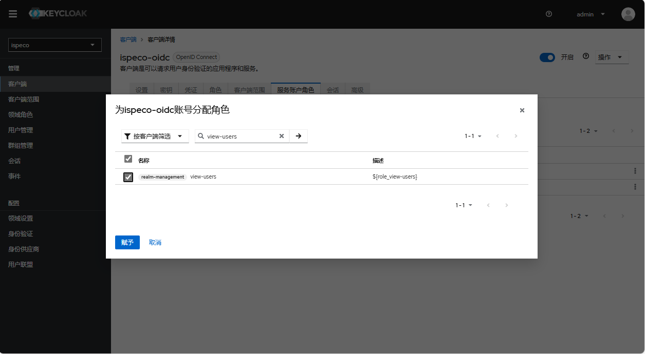 - 在分配角色页面,筛选器选择按客户端筛选,搜索框中输入 view-users,勾选 view-users,点击赋予,分配角色成功: