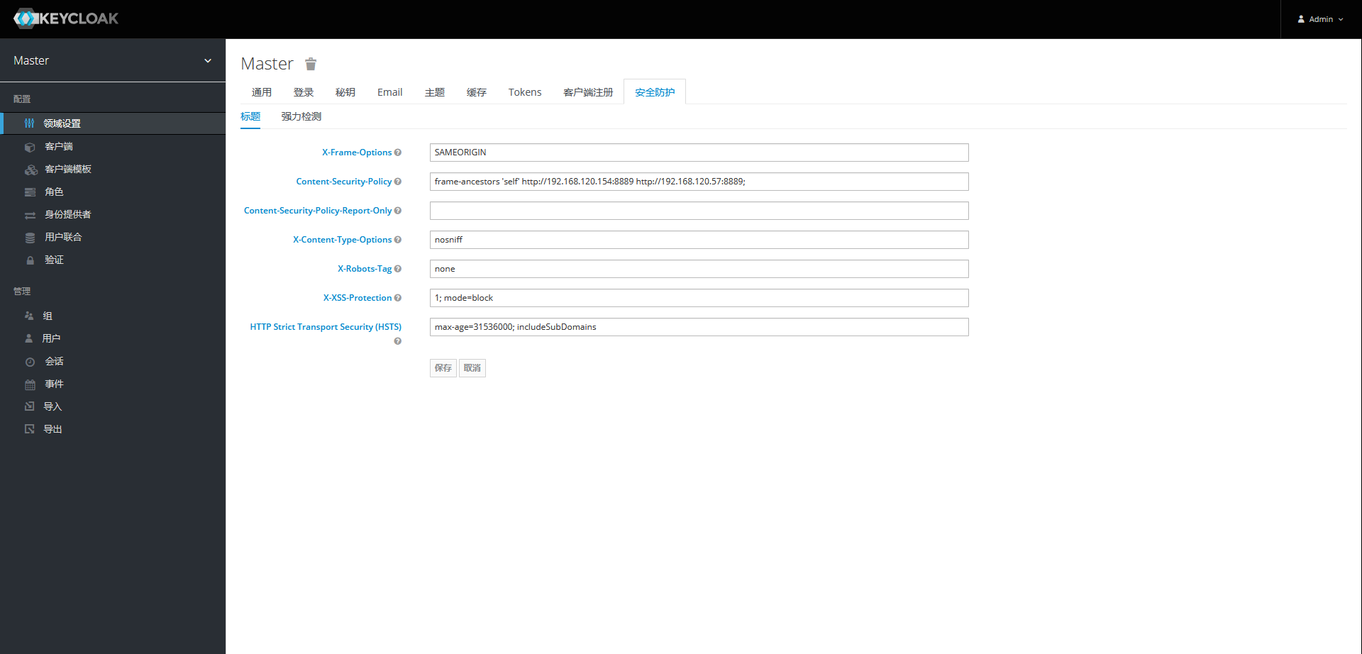如果您的 iPortal 和 Keycloak 不同源,并且希望 iPortal 以 iframe 的形式加载 Keycloak 的登录页面,那么需要在【SuperMap iPortal 安装目录】\webapps\iportal\WEB-INF)文件夹下的 iportal.xml 配置文件中将<iframeable>参数设置为true(默认为false,具体请参见:iPortal 配置文件说明), 还需要在 Keycloak 的领域设置中按需修改相关的安全策略配置。