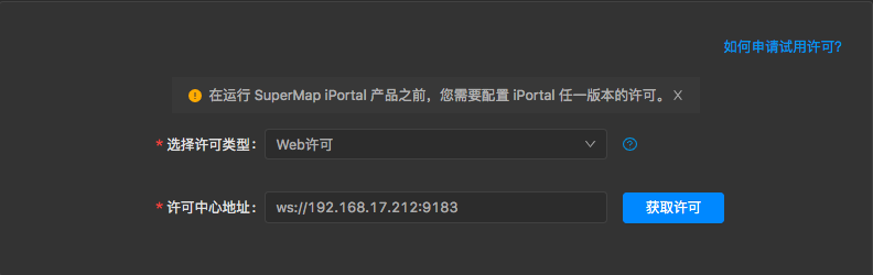 正式版 Web 许可请联系销售获取,试用版许可可以在线申请获取,申请地址:https://www.supermapol.com/web/pricing/triallicense。