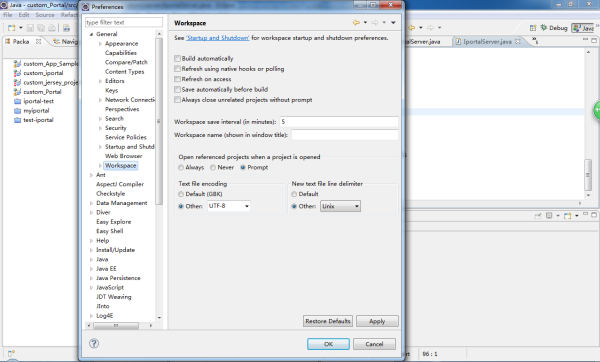 启动 Eclipse,选择 Window > Preferences,在 Preferences 对应的窗口左侧菜单中选择 General 并展开,选中 Workspace,在右侧菜单中 Text file encoding 下面勾选 Other,选择 UTF-8,同样,在 New text file line delimiter 下面勾选 Other,选择 Unix,如下图所示,点击 OK。