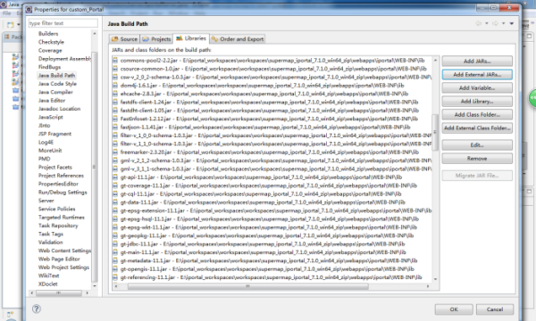 第七步:配置依赖的 jar 包。在 Eclipse 中,右键点击 Custom_Portal 工程,选择 Build Path > Configure Build Path,在弹出的对话框中点击 Libraries 选项卡,点击 Add External JARs 添加以下 jar: