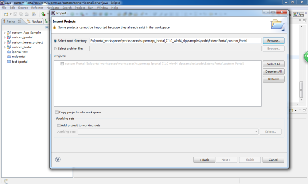 第五步:在 Eclipse 中引入定制开发工程,点击 Eclipse 的 File 菜单,然后点击 Import,在 Import 选项卡中选择 General 并展开,点击 Existing Projects into Workspace,然后点击 Next,找到位于 D:\SuperMap\eclipse-workspace 目录下的工程 Custom_Portal,如下图所示,点击 Finish,导入项目完成。