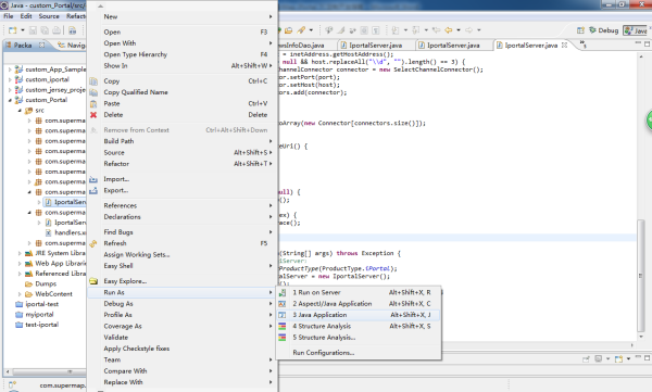 第九步:右键点击 Custom_Portal 工程下的 IportalServer.java 类(位于 src > com.supermap.iportal.web.custom.server 包中),然后选择 Run as > Java Application ,服务启动成功,可通过 localhost:8091/iportal 进行访问。
