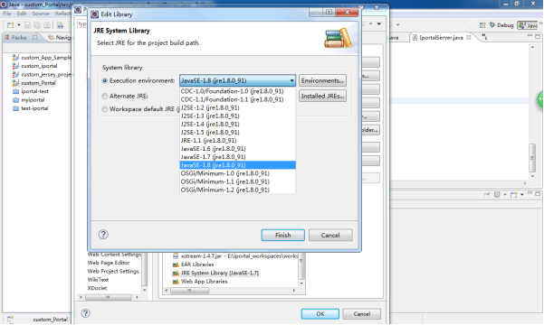 第六步:在 Eclipse 中,右键点击 Custom_Portal 工程,选择 Build Path > Configure Build Path,在弹出的对话框中点击 Libraries 选项卡,拖动下方滚动条选中 JRE System Library,然后点击右侧的 Edit 按钮,选择自己本机配置的 JDK 11 版本,如下图所示:
