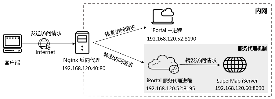 在实际的业务应用中,应用系统使用的服务可能来源于多台 SuperMap iServer 以及其他 GIS 平台厂商的 Server,SuperMap iPortal 通过服务代理功能,在门户级别实现对这些多源服务进行统一的权限控制,iPortal 作为这些服务的统一出口,便于多源服务的统一使用、管理和维护。此外, iPortal 也支持反向代理,您可以将服务代理与 Nginx 反向代理配合使用,进一步保障门户系统安全。