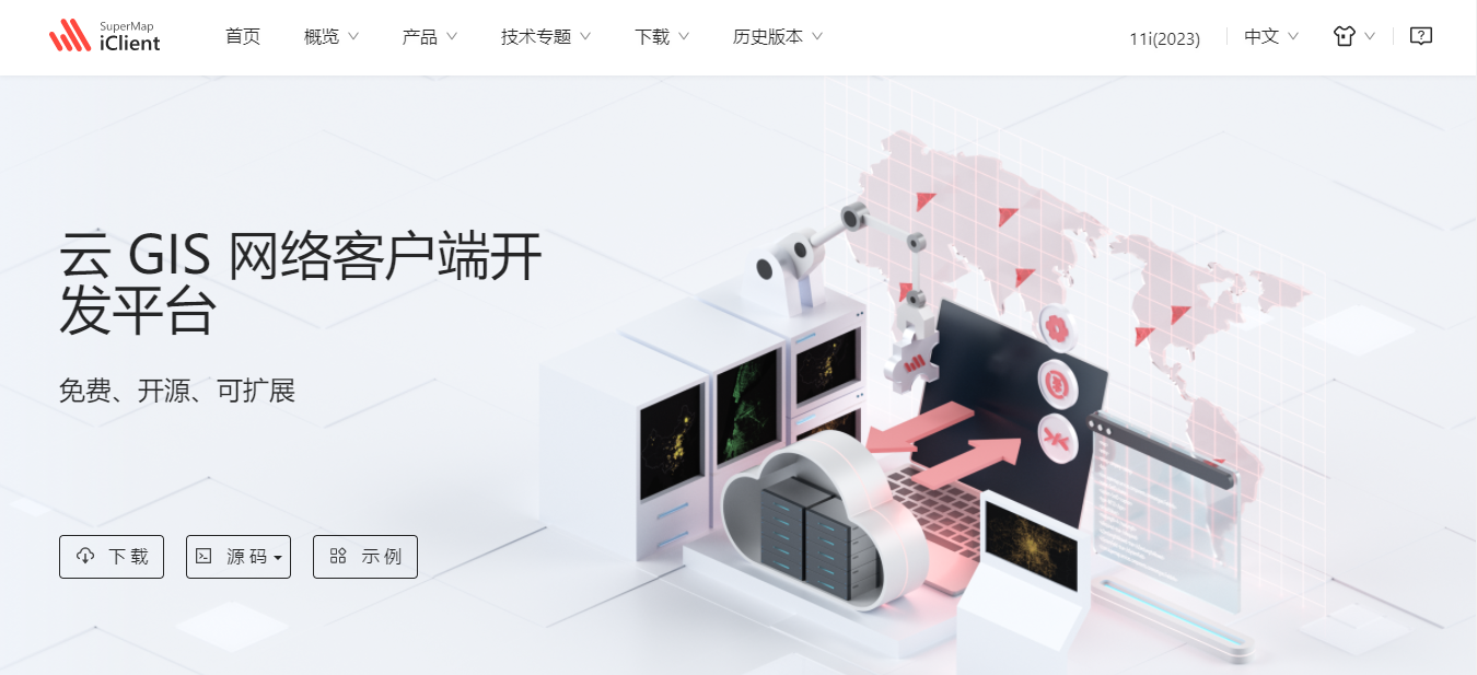 点击“开发中心”导航栏,即进入开发中心页面,这里以 SuperMap iClient JavaScript API 为例,如下图所示: