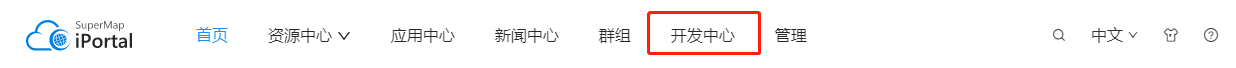 返回 iPortal 门户首页,在导航栏中即可看到新添加的“开发中心”导航栏,如下图所示: