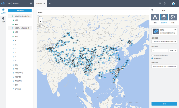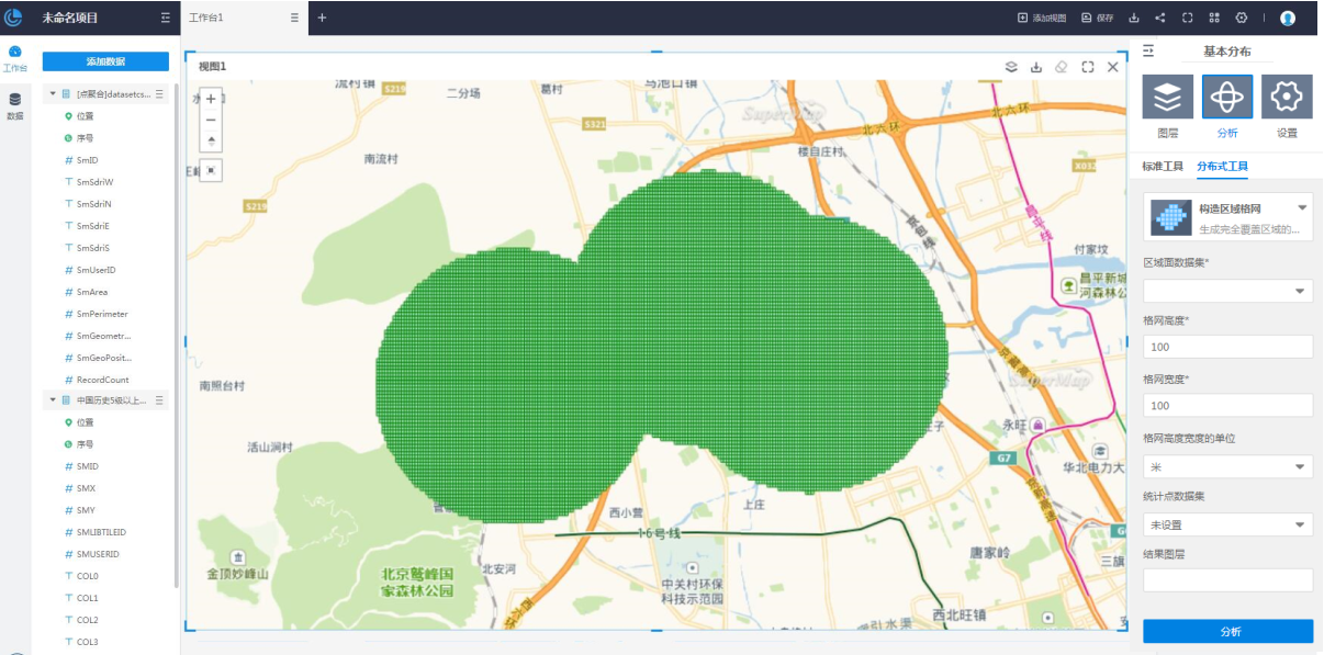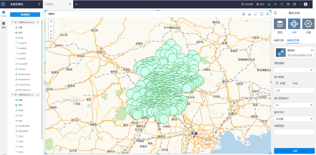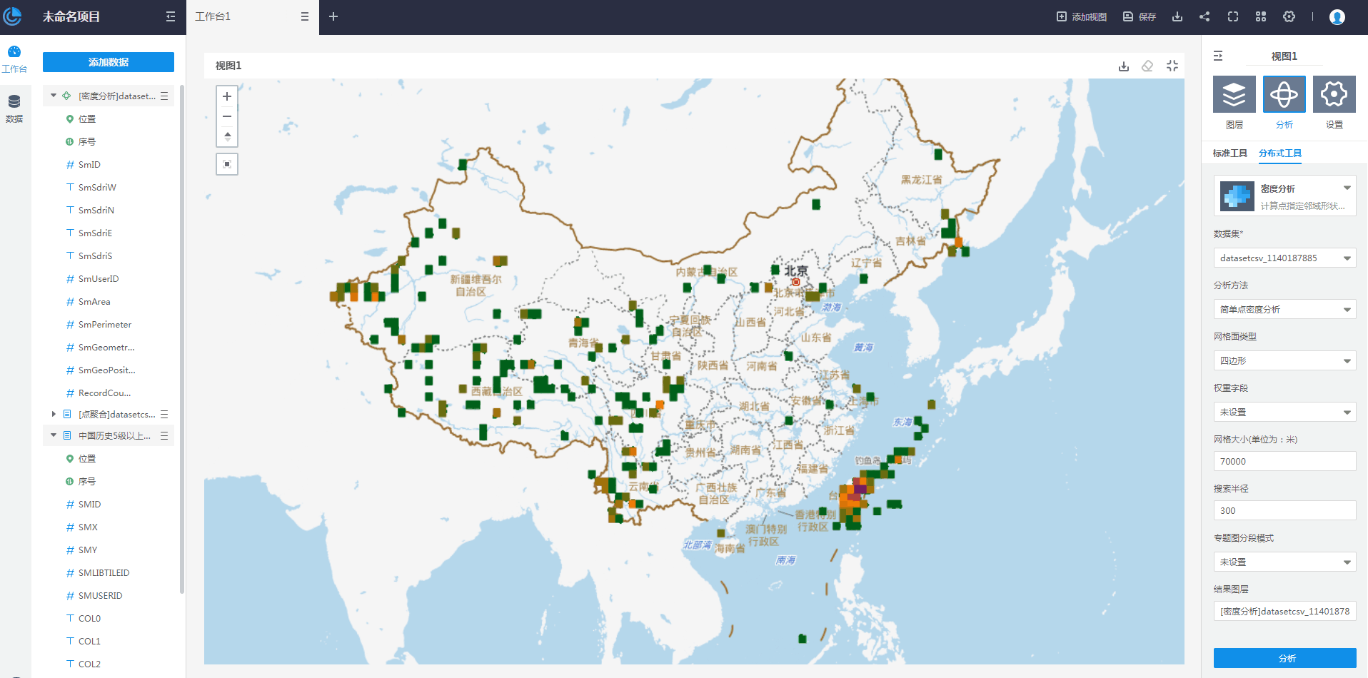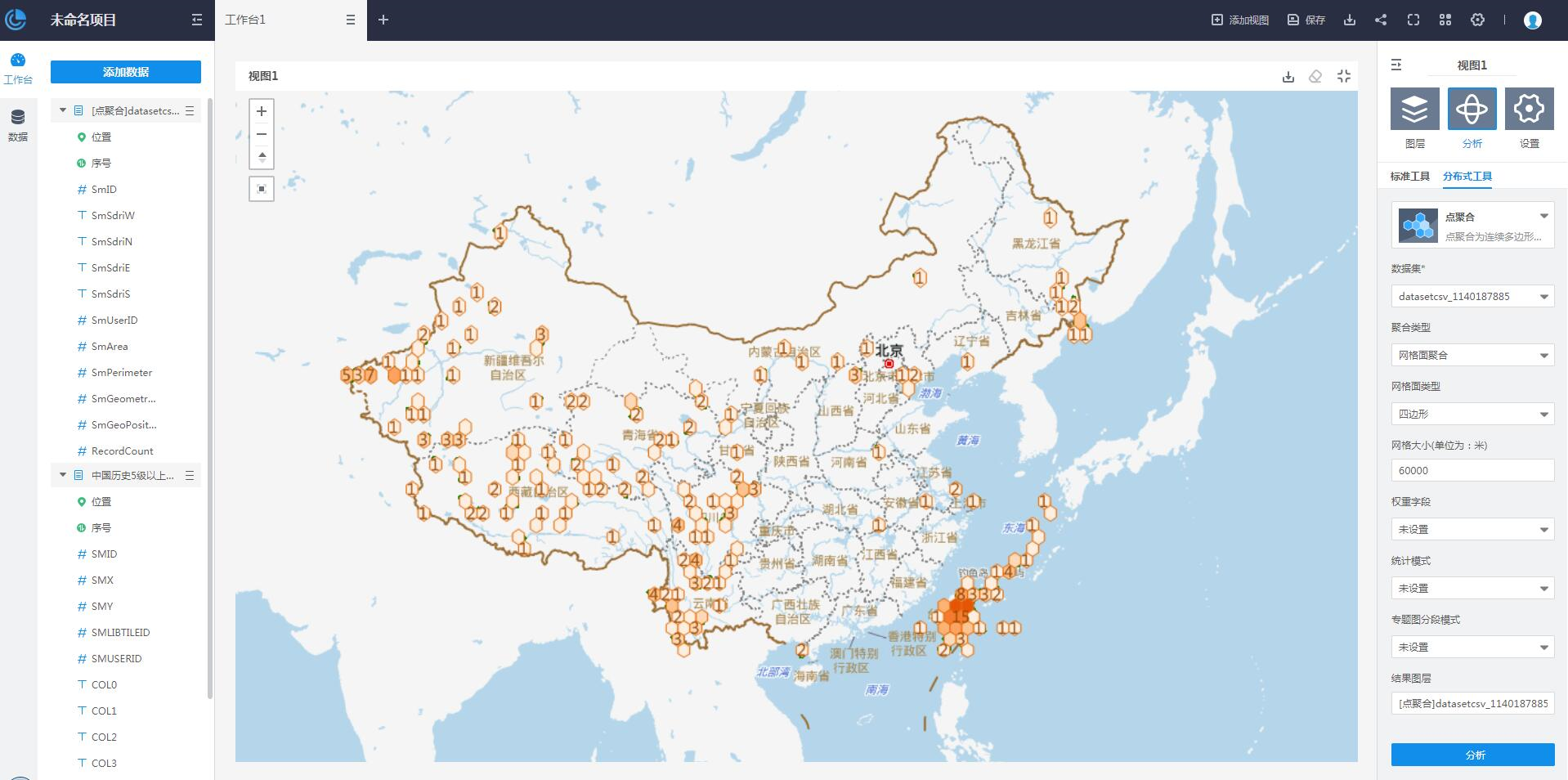 在右侧工具栏中选择“分析->分布式工具->点聚合“,开始点聚合分析作业。