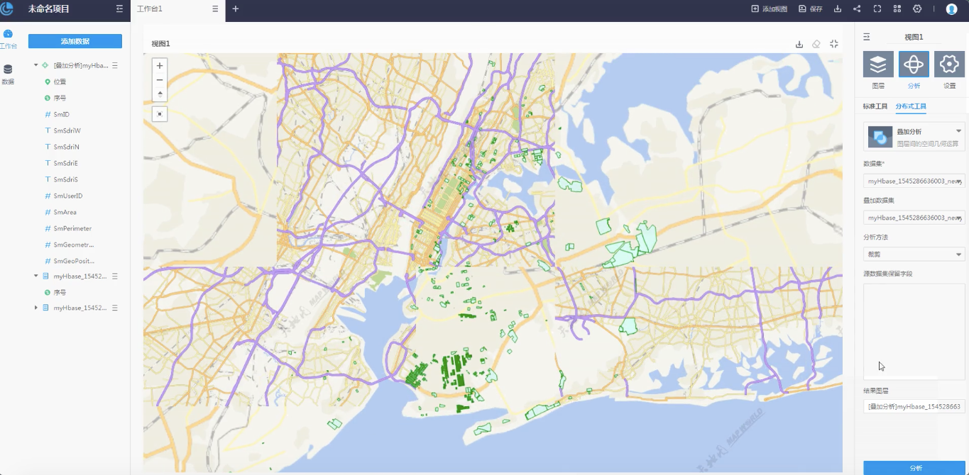数据洞察支持对配置了关系型存储的 CSV、Excel、GeoJSON 格式数据、注册的用户自管理的 HDFS 数据进行分布式空间分析。使用分布式分析功能,需要管理员配置分布式分析服务器,具体配置过程请参见:空间分析服务配置。