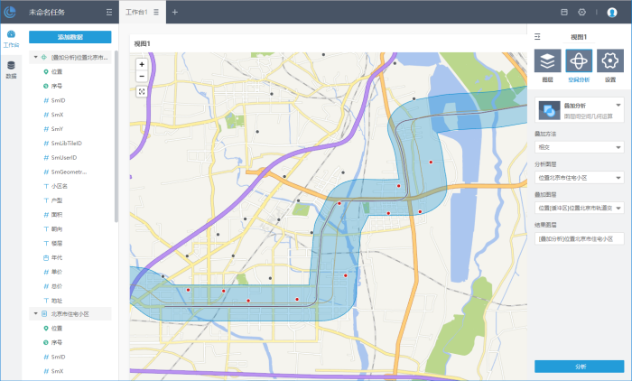 叠加分析是通过对空间数据的加工或分析,提取需要的新空间几何信息的一种分析方法。比如需要了解某一个行政区内的土壤分布情况,就可以根据全国的土地利用图和行政区规划图这两个数据集进行叠加分析,得到需要的结果。叠加分析广泛应用于资源管理、城市建设评估、国土管理、农林牧业、统计等领域。数据洞察提供的叠加分析,如下图所示,通过叠加分析,计算出地铁周边1公里范围内有哪些小区。数据洞察中叠加分析支持的还包括:裁剪、擦除、同一、相交、合并、更新等多种运算方式。