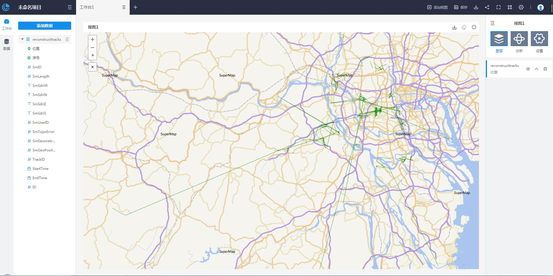 轨迹重建功能可以通过不同时间下物体所处的不同位置,来重建轨迹线或轨迹面,描述出该物体的运动轨迹,同时可对指定属性进行统计。例如车辆在行驶时会每隔一段时间将其所处的位置通过 GPS 上传到服务器中,这样在服务器中就会存储该辆车的 GPS 数据,而通过该数据可以使用轨迹重建功能来构造出车辆在一段时间内的运动轨迹,更直观的看出车辆的运行状态。要进行轨迹重建分析,数据集中必须包含时间属性字段。