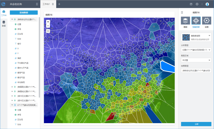 泰森多边形可用于定性分析、统计分析和邻近分析等。例如可以用离散点的性质来描述泰森多边形区域的性质,可以用离散点的数据来计算泰森多边形区域的数据,并且可以通过泰森多边形直接得出判断一个离散点与其它哪些离散点相邻。数据洞察中支持泰森多边形分析,分析数据的类型必须为点,分析结果为面数据,每个面中有且仅有一个点数据,面对象的属性与点对象相同,并且可指定裁剪范围,具体操作为当前视图增加一个面图层,然后设置裁剪图层名称,生成的结果仅包含在面范围内,如下图所示: