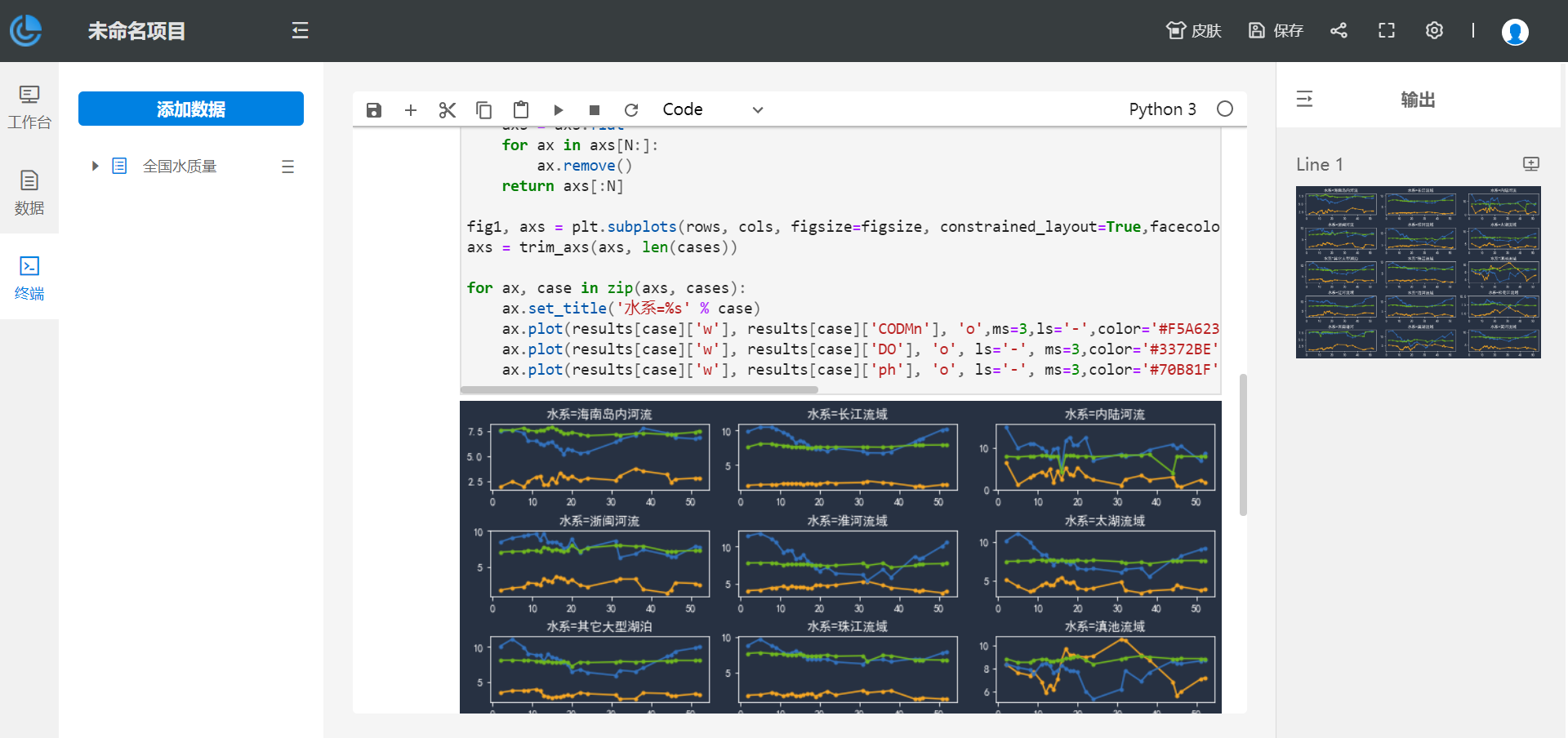 成功连接服务后,会默认新建一个空白的 Notebook。在该 Notebook 页面,您可编写、运行 Python 代码。也支持将本地 .py 格式文件拖拽到 IN 输入框中直接运行。此外,支持将数据洞察中的数据作为 Notebook 的数据源;操作:从左侧展开的数据中,单击选择列表中的某一数据字段拖拽至右侧需要赋值的变量行内。