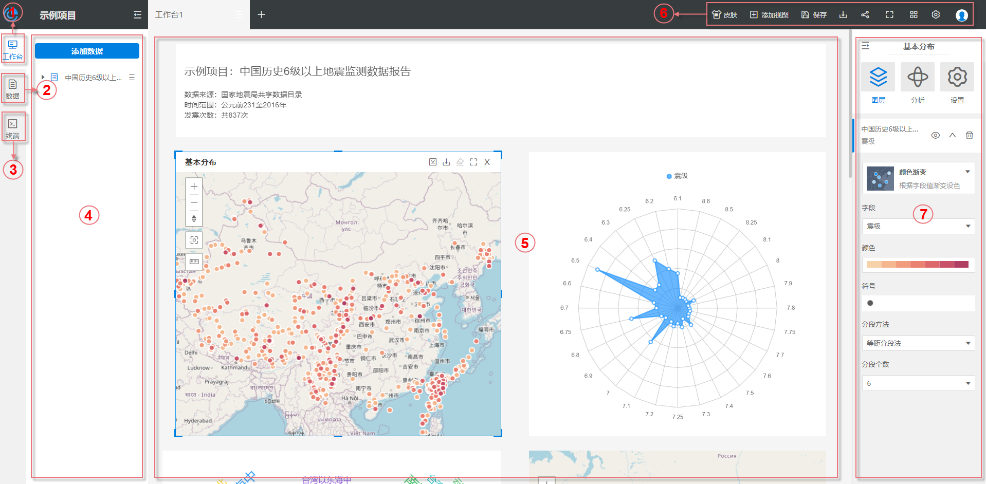 工具栏:包含换肤(深色模式和浅色模式)、添加视图、保存、导出(导出工作台所有视图卡片成 PNG 或 PDF)、分享、全屏、视图设置(包括图表联动和地图同步)、设置(洞察项目的标题/描述、数据无效值处理、地图视图默认底图的统一设置、分析设置)、个人中心。