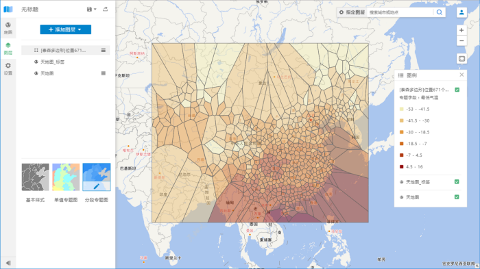 如下图所示,数据洞察中分析生成泰森多边形,支持数据上图中继续编辑和制图,实现数据与数据在 iPortal 的多个 WebApp 之间共享。
