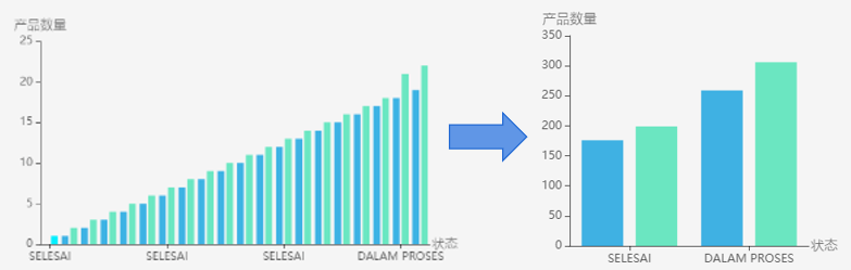 以下面的数据为例,对X轴的属性“状态”进行分组并选择“求和”方式进行图表统计后,统计结果将显示在条形图中。统计前条形图可见图 1,统计后的条形图可见图 2。选中某一列数据后,该列数据所在分组所对应的要素将在图中高亮显示。