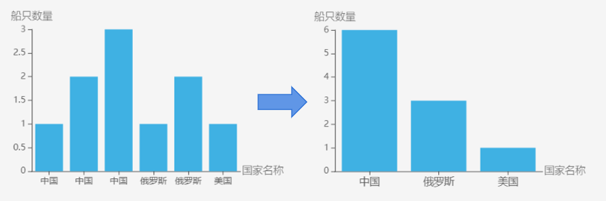 以下面图表中的数据为例,在条形图组件中将该数据作为数据源,X 轴数据选择“国家名称”,Y 轴数据选择“船只数量”,然后进行图表统计,统计方式选择“求和”。此操作的目的是将“国家名称”作为分组字段,将“船只数量”作为属性字段,对每个国家的船只数量进行求和统计。图表统计前条形图可见图 1,图表统计后的条形图可见图 2。