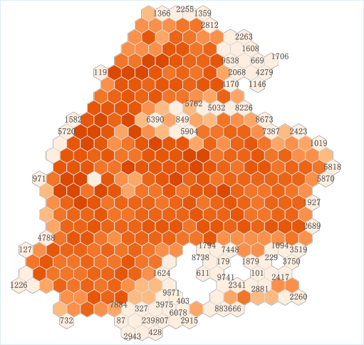 现有全国范围的某品牌门店营业数据,将位置汇总到格网(四边形,六边形)中,再在每个格网中进行属性的统计计算,可以统计店铺数目,也可以统计销售额总和、最大销售额等信息。六边形格网汇总示例如下图所示: