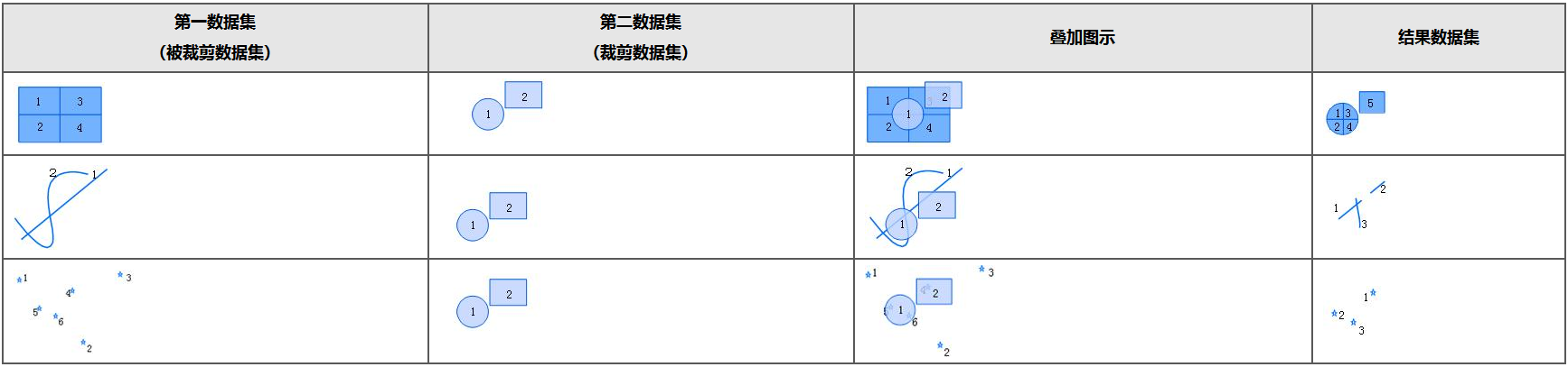 - 裁剪:从被裁剪(源)数据集中提取部分特征集合,只有落在裁剪(叠加)数据集多边形内的对象才会被输出到结果数据集中。