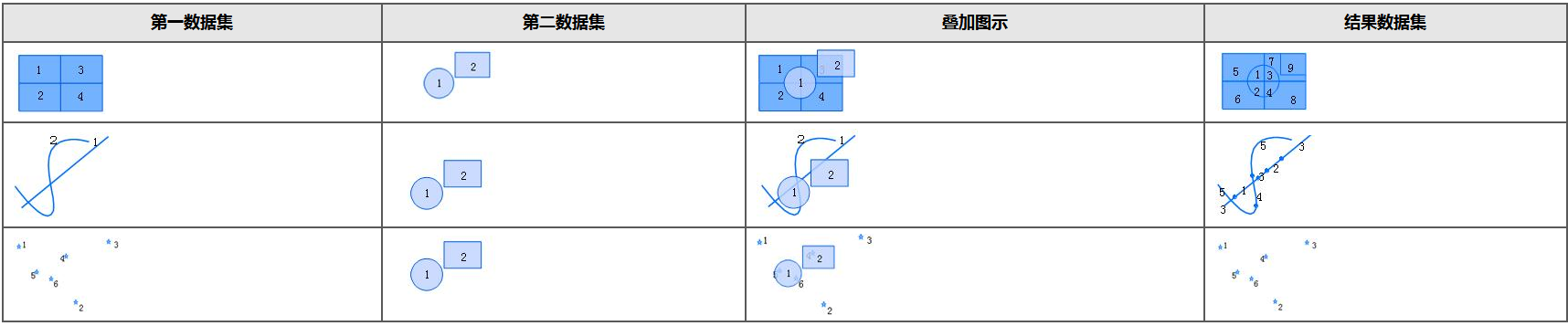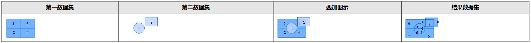 叠加分析是 GIS中的一项非常重要的空间分析功能,是指在统一空间参考系统下,通过对两个数据集进行的一系列集合运算,产生新数据集的过程。