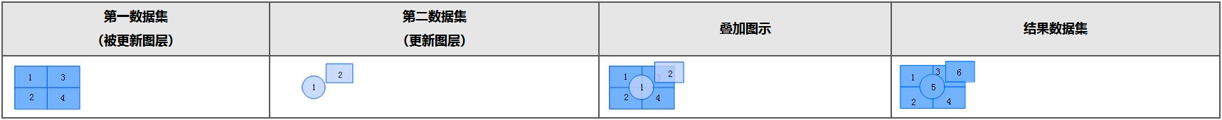 - 更新:更新运算是用更新(叠加)图层替换与被更新(被叠加)图层的重合部分,结果数据集中保留了更新数据集的几何形状和属性信息。