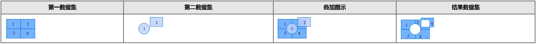 - 异或差:对于被叠加数据的每一个面对象,去掉其与叠加数据相交的部分,保留剩下的部分。