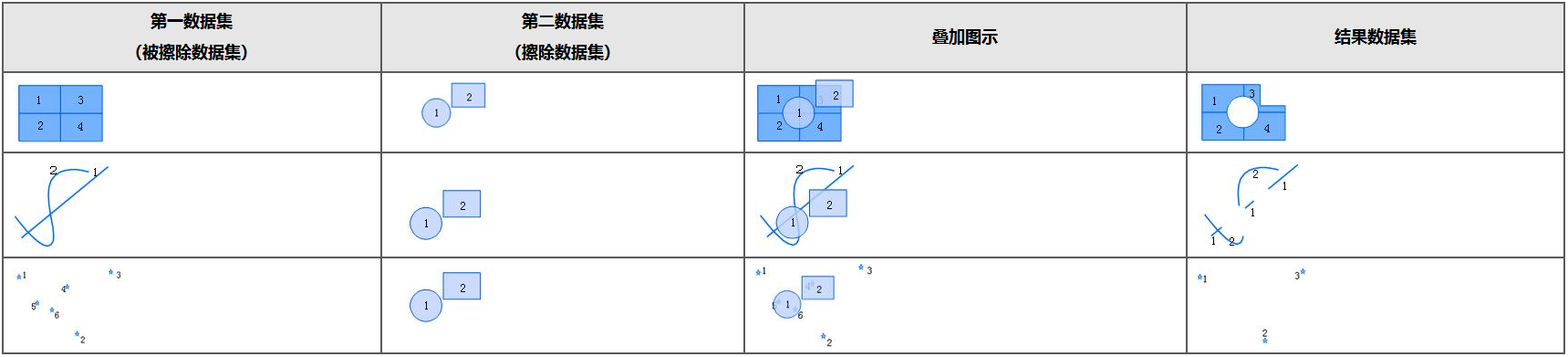 - 擦除:擦除数据集(叠加)定义了擦除区域,被擦除数据集(源)中凡是落在这些多边形区域内的特征要素都将被去除,而落在多边形区域外的特征要素都被保留,与裁剪运算相反。
