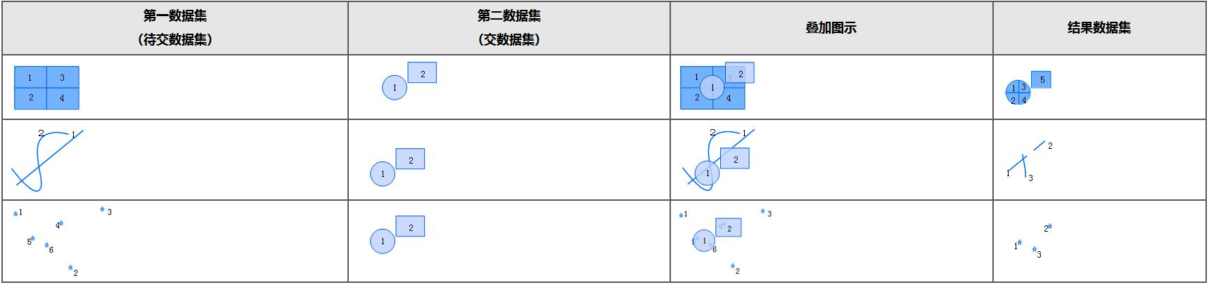 - 相交:待求交(源)数据集的特征对象在与交(叠加)数据集中的多边形相交处被分割(点对象除外),结果数据集保留原来两个数据集的重叠部分。