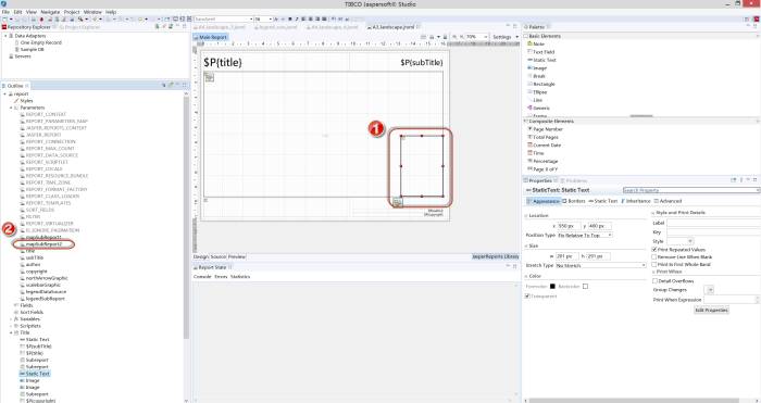 - 双击打开布局模板文件(位于【iServer根目录】/webapps/iserver/templates/webprinting-layouts 目录中),以 A3_landscape.jrxml 为例,在 Jaspersoft Studio 软件中打开,将下图中1所示的小地图的两个框删掉,将图中2所示的小地图参数删掉。