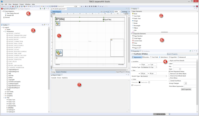 首先简单介绍一下 Jaspersoft Studio 软件中各个主要部分,如下图所示: