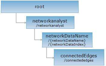 connectedEdges 表示连通性分析,对 connectedEdges 执行GET请求,可查找与给定结点或者弧段相连通的弧段,查找出连通弧段后,可根据网络拓扑关系,即弧段的起始结点、终止结点查询出相应的连通结点。