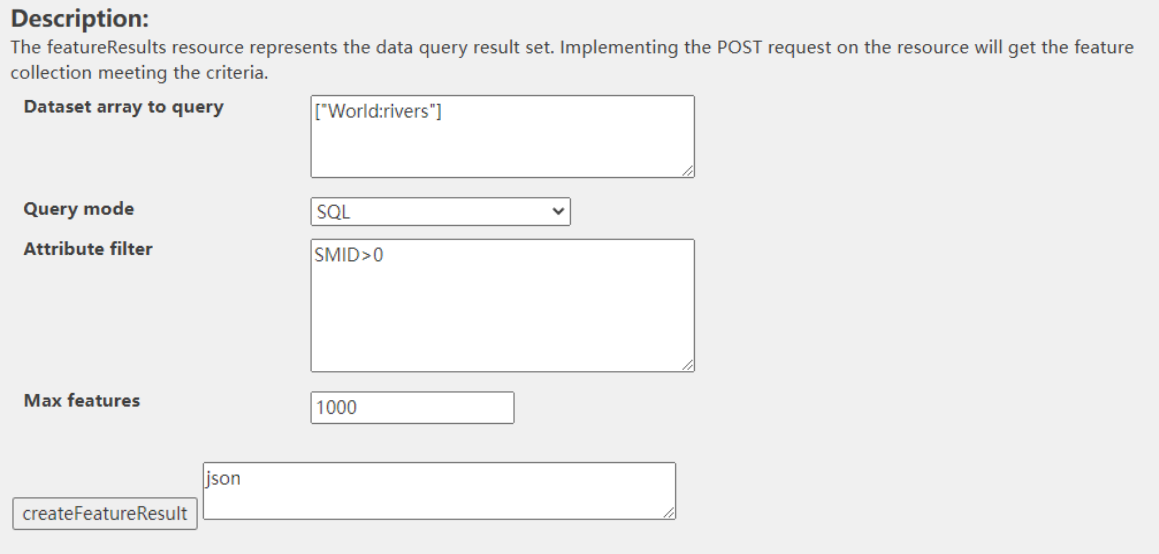 2.In the featureResult resource page, enter ["World:rivers"] in the text box > select SQL for the query mode > enter SMID>0 in the feature filter > click createFeatureResults to query data. The parameter explanations are as follows: